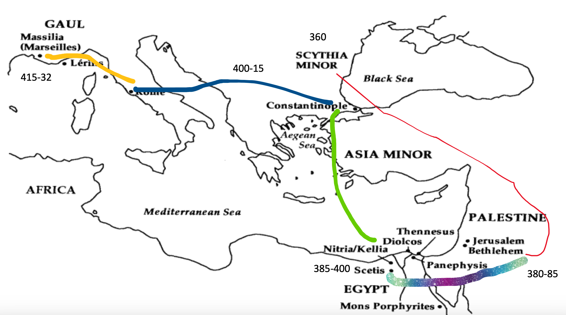 卡西安是拉丁教父传统中,我认为在早期唯一一位将东方教会的灵修传统实实在在传入西方的第一人。我将为大家展示一张地图,以便大家简单了解卡西安的行程。首先,他从故乡罗马尼亚地区直接前往现在的巴勒斯坦地区,包括耶路撒冷和伯利恒,在那里成为修士。成为修士五年后,即在他二十岁时,前往埃及的圣安东尼修道地区,去做修士,大约在那个时期,即公元380年至411年之间,他拜访了修院,为期十年,实实在在地前往他们的修院,拜访了这些阿爸,记录了他们的言行。之后,由于奥利金主义,他便前往君士坦丁堡,在当时接见了金可约翰,金可约翰将他安立为神职。然后,他又前往罗马地区,大约是在公元411年至公元415年之间,他当时在罗马地区。最终,于415年在法国的高鲁地区(今马赛尼尔)建立了卡西安修院。