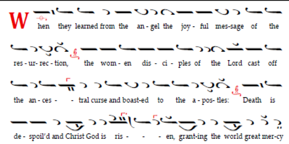 对于赞美诗来说,这种最基本的音乐处理自然是不够的。音乐的下一阶段是以音节吟唱的形式出现的,大概早在教会建立之初就出现了,但肯定是随着 5 世纪短篇颂歌 (Troparia) 的出现以及后来较长的诗歌体裁「叙事」颂歌集 (Kanon)3 的出现。这些赞美诗的目的是赞美基督或圣人,或回顾神圣的历史时刻,通常具有准叙事性。这些赞美诗采用简单的音节处理,节奏明快,充满活力。下面是一首颂扬基督复活的赞美诗。这首赞美诗篇幅虽短,却蕴含着丰富的神学意义,它既是在讲述一个故事,也是在向会众传授一种信仰。