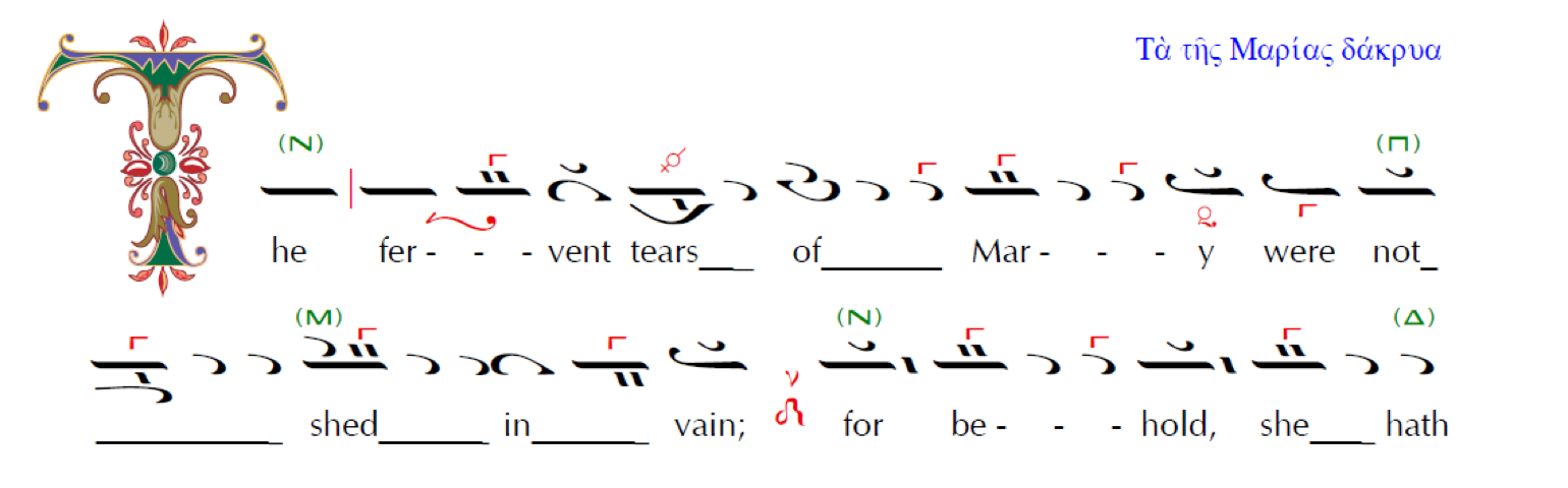 Most of the chants of the daily office belong to this category. However, at the conclusion of a group of hymns or of a section of a service, there is a noticeable rise in intensity often accompanied by movement. For example, at the conclusion of the first part of Vespers, the priest holding the Gospel or a censer comes out of the altar. Such climactic moments are usually accompanied by neumatic chants, which are performed with more musical elaboration, text-painting, and at a more solemn tempo. Here is the opening line from The fervent tears of Mary, one of eleven hymns chanted at the end of Sunday morning service. Notice the sorrowful character that the chromatic notes give to the word “tears” and the descending figure which illustrates the “shedding of tears.”