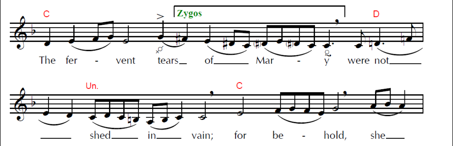 日常圣咏大多属于这一类。不过,在一组赞美诗或仪式的一个部分结束时,力度会明显加大,通常还伴有动作。例如,在晚祷(Vespers)第一部分结束时,手持福音书或香炉的神父会走出祭坛。这种高潮时刻通常伴随着新咏,新咏的音乐阐述和文字描绘更加细腻,节奏也更加庄严肃穆。下面是《马利亚热切的眼泪 The Fervent tears of Mary》的开头一句,这是主日上午礼拜结束时吟唱的 11 首赞美诗之一。请注意半音阶音符赋予 “泪水 “一词的悲伤特征,以及描绘 “流泪 “的下行数字。
