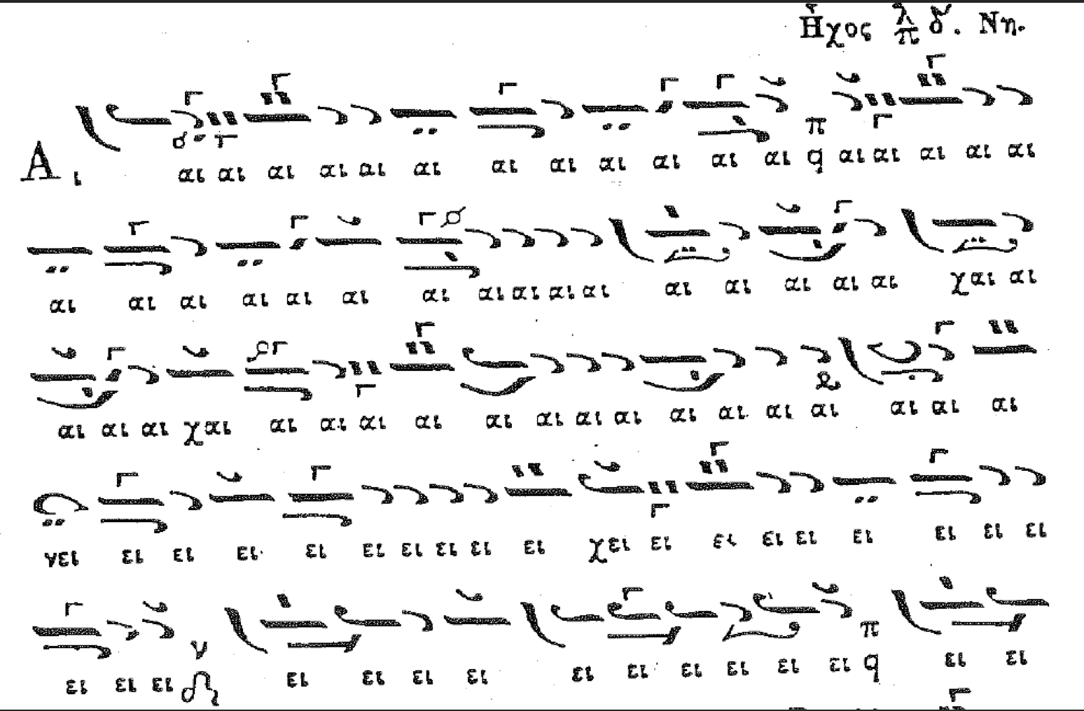 These three types of chants, the syllabic, neumatic, and melismatic, can be characterized as the people’s words of praise, thanksgiving, expression of repentance, and supplication to God. However, there is another genre of Byzantine chant in which words disappear altogether. It is the Kratima, which some musicologists characterize as the pinnacle of Byzantine musical creation. The Kratima emerged in the late 13th century initially through the expansion of intonation formulae and melismas by virtuoso cantors in Hagia Sophia and other cathedrals of Constantinople. But extra-musical considerations probably played a role in its further development. The 14th century was a century of intense theological debates on the nature of God and the possibility of humans’ partaking of the divine energies. The Eastern position was articulated by St. Gregory Palamas who argued that the Prayer of the Heart can lead to a vision of God’s Uncreated Light. This ascetic method of prayer, known as Hesychasm, consists in the focused repetition of the short phrase “Lord Jesus Christ, Son of God, have mercy on me a sinner,” which in more advanced stages is shortened to “Lord Jesus Christ have mercy on me,” later to a simple repeated invocation of the name of Jesus, and finally to utter silence, ἡσυχία, which is the root of the word Hesychasm. In this spiritual and intellectual atmosphere, the Kratima can be viewed as a musical analogue of the Jesus prayer. The worshiping soul reaches a stage in which words are no longer sufficient to express its longing for a union with God, and thus resorts to pure music. Words of or to God cease altogether, in order for an intimate relationship with God to be cultivated. A similar notion had been expressed a thousand years earlier in the West by St. Augustine of Hippo: “Do not go seeking lyrics, as though you could spell out in words anything that would give God pleasure. Sing to him in jubilation. That is what acceptable singing to God means: to sing jubilantly. But what is that? It is to grasp the fact that what is sung in the heart cannot be articulated in words. Think of people who sing at harvest time, or in the vineyard, or at any work that goes with a swing. They begin by caroling their joy in words, but after a while they seem to be so full of gladness that they find words no longer adequate to express it, so they abandon distinct syllables and words, and resort to a single cry of jubilant happiness…You cannot speak of him because he transcends our speech; and if you cannot speak of him, yet may not remain silent, what else can you do but cry out in jubilation, so that your heart may tell its joy without words, and the unbounded rush of gladness not be cramped by syllables?” We will conclude with a Kratima:
