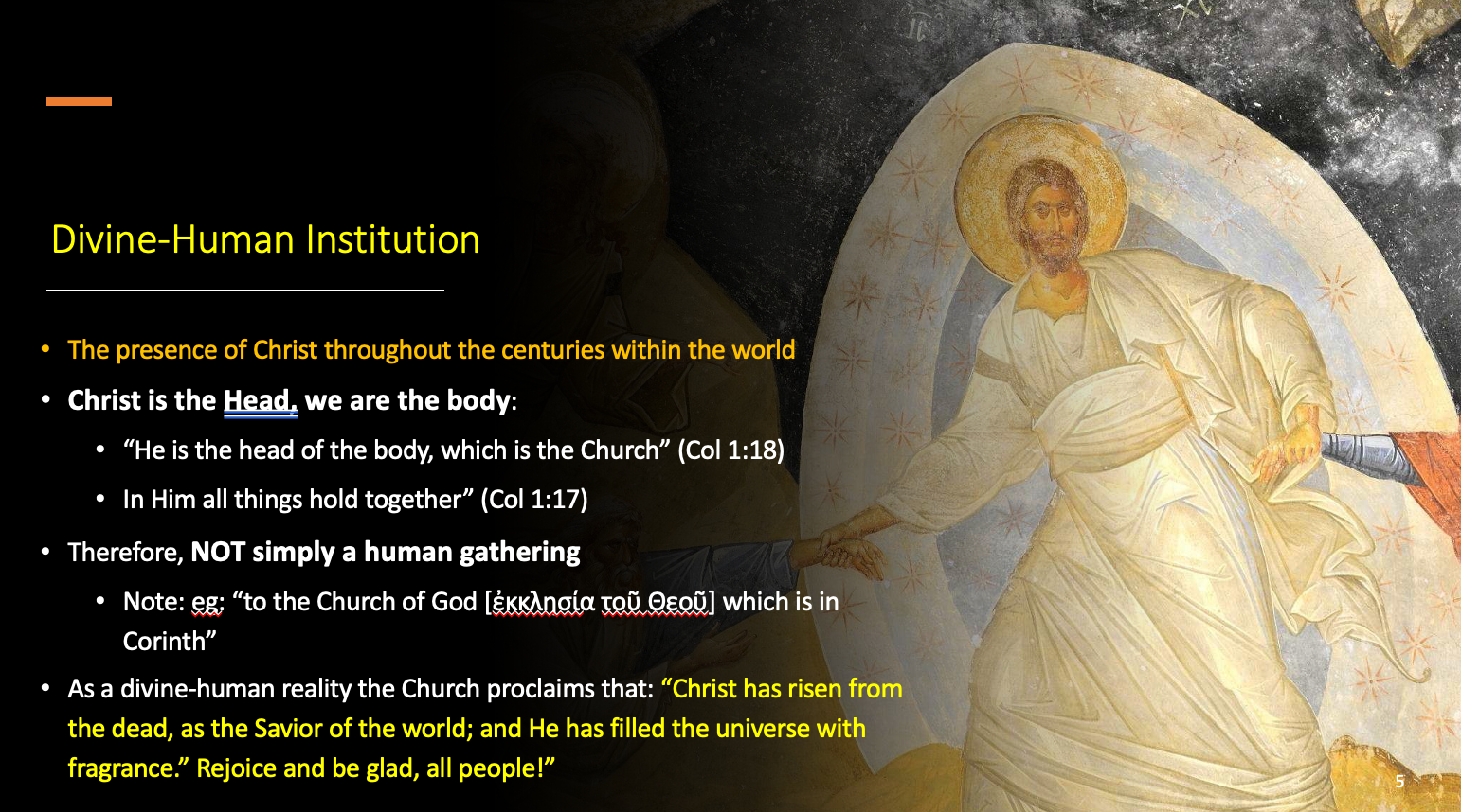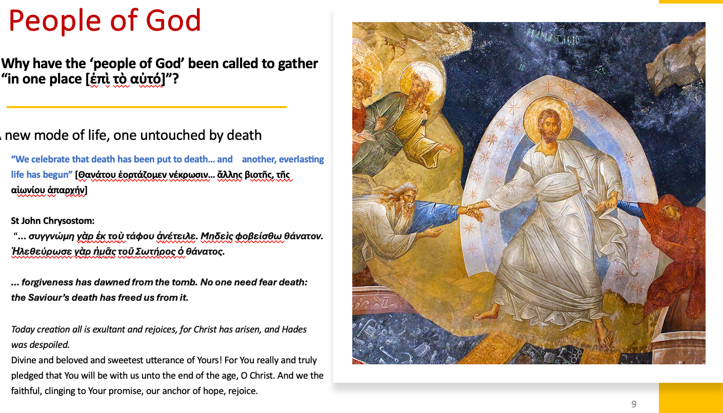 这里发生了什么?从幻灯片中我们可以看到 最后一点是,作为神圣的人类实在。教会就向这首赞美诗------东正教会在主日唱的------所宣告的: 基督从死里复活,作为世界的救世主,他让万有充满 馨香,让众人欢喜快乐。