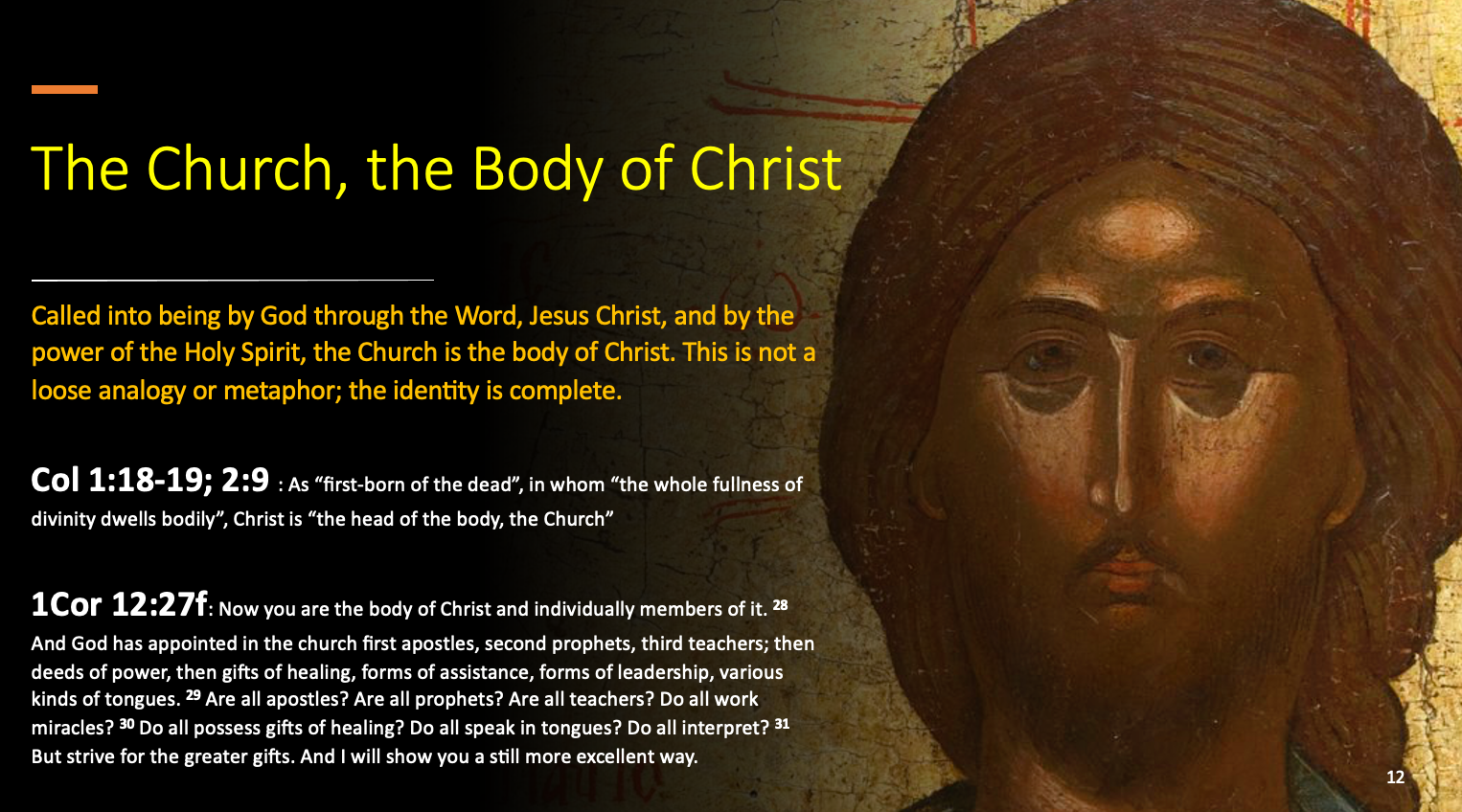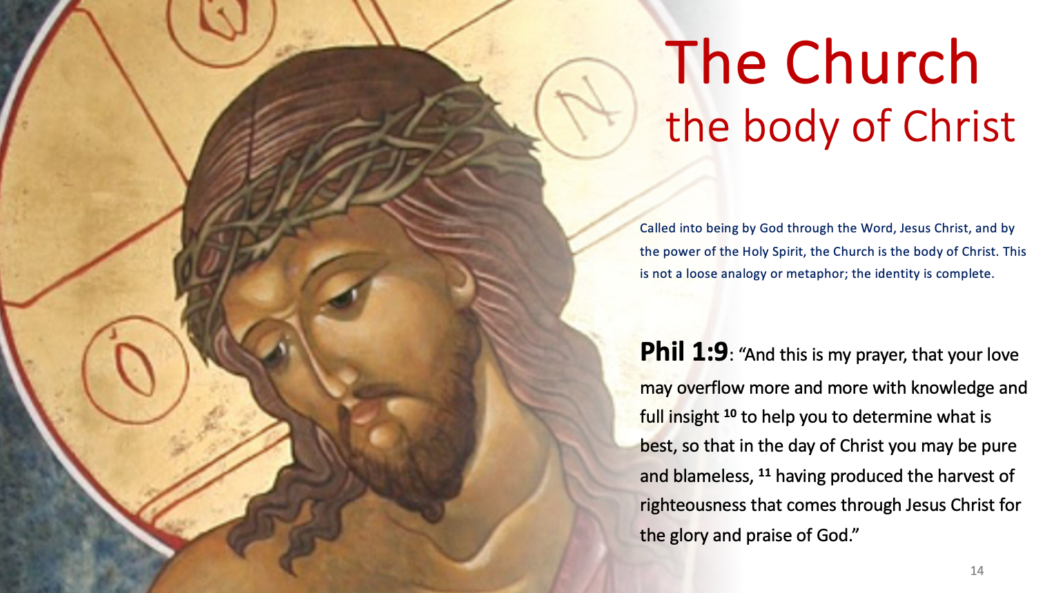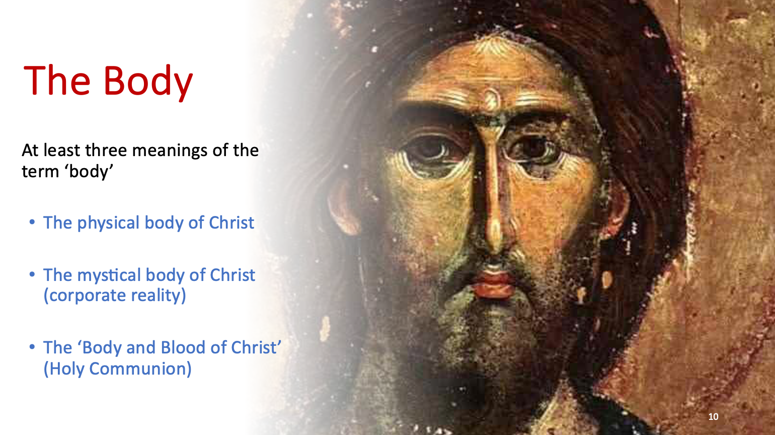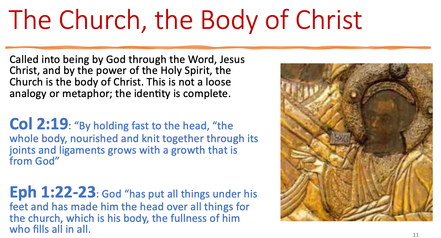 现在请转向第二幅图像。教会,基督的身体。在圣经中,身体一词至少有三种不同的用法。身体指的是基督实际的肉身。身体是指基督神秘的身体,也就是教会。第三个,当然,基督的身体指的是圣餐,基督的身体和宝血。