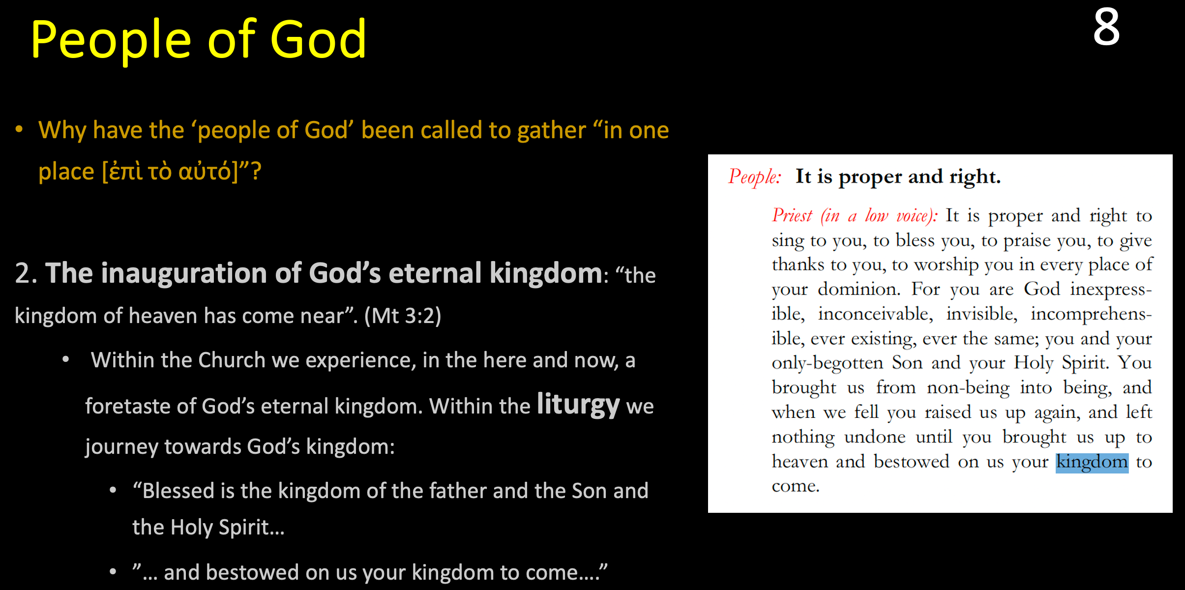 我们与基督同在,我们被带到基督,上帝,将来的国面前。这是在圣礼仪中的一个祷文:但这里重要的是最后几行。它说:基督和上帝,不要停止,直到他的国度会降临在人们身上。这就是我们在最后祷告中的几句话,在幻灯片的右边。