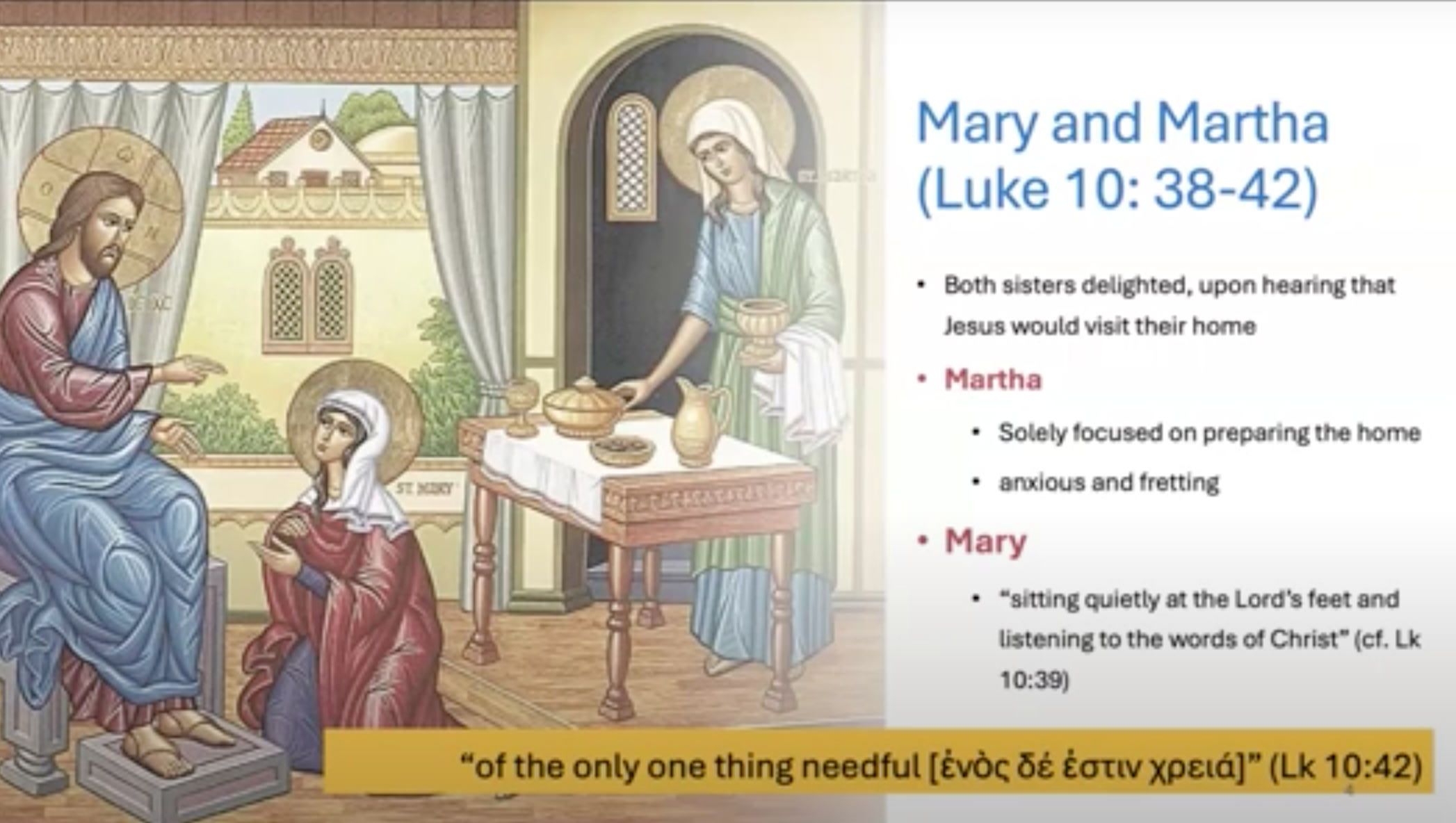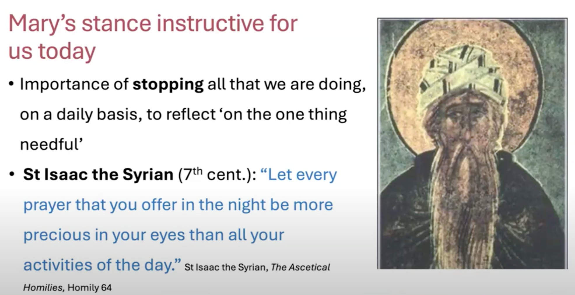 So a great temptation for all of us today, is that we can engross ourselves in our work, and whatever else we do to such a great extent, that we can starve ourselves of being spiritually nurtured. We starve ourselves of the only one thing needful. So the example of Mary in this story, is a compelling reminder for the need on a daily basis for silence and reflection. So the example of Mary in this story, is that we must be silent and pray in our daily lives. This is the only important thing. So we must find ways, as St. Paul tells us, from wandering away into endless myths, into fictitious fantasies and distractions. We must reorientate our minds, St. Athanasius would say, back onto Christ.