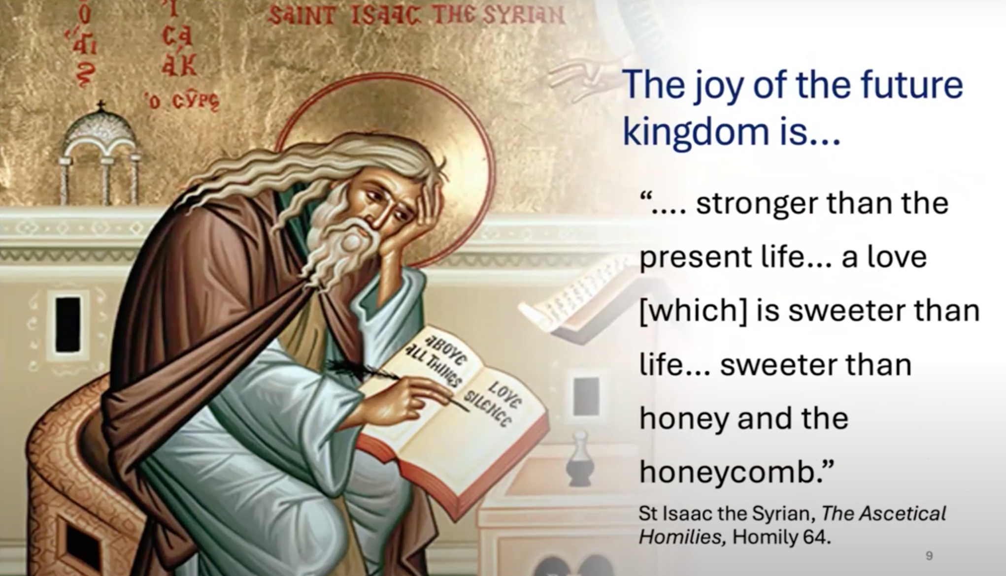 So our future is God’s heavenly kingdom And again to quote from Saint Isaac the Syrian The joy of the future kingdom is stronger than this present life…a love which is sweeter than life …honey and the honeycomb It’s a life which is permanent and not fleeting