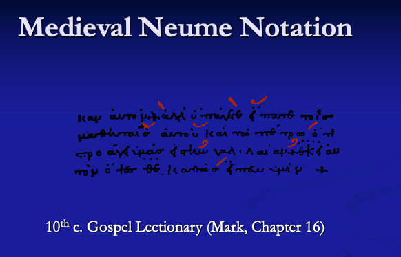 最早的基督教音乐符是来自于三世纪晚期。是来自于一个来自于埃及,来自一个Oxyrynchus的村庄,是圣三一颂。希望你能看到就是在屏幕,比如说第一行,下面是希腊字母,上面更细的线是音乐符。
