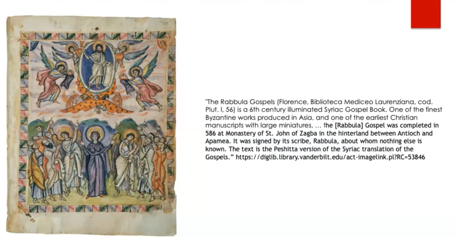 大家所看到的这个场景,是取自六世纪福音书手抄本上所描绘的基督升天节画面。这样的一页。这个手抄本名为《Rabula福音书》,是六世纪时在亚洲手抄完成的圣经文本,具体而言是这部福音书的文本内容。在东正教中,这类文本在每个家庭拥有私人圣经之前,主要用于礼仪场合。每个教会教堂都会有一本,如同一件宝物。其装饰极为精美,包含各种金银等材料,封面还镶嵌着宝石等珍贵物品。它通常在礼仪场合使用。象征着基督的道成肉身,具有礼仪性质。这部作品带有大量圣像,是六世纪用叙利亚文写成的福音书。它展现了拜占庭风格的特征。这种风格属于拜占庭风格的圣像画。这是目前已知最早的升天节主题圣像。大家可以看到,早在六世纪时,这一传统就已经固定下来。如今我们所见的圣像正是这一传统延续的体现。在二十一世纪所见到的所有东正教的升天节圣像,它们在风格上会有一些细微的差异。但是基本上其形式已经固定下来。因此,它确实是教会传统的重要组成部分,没有人能够轻易改变。