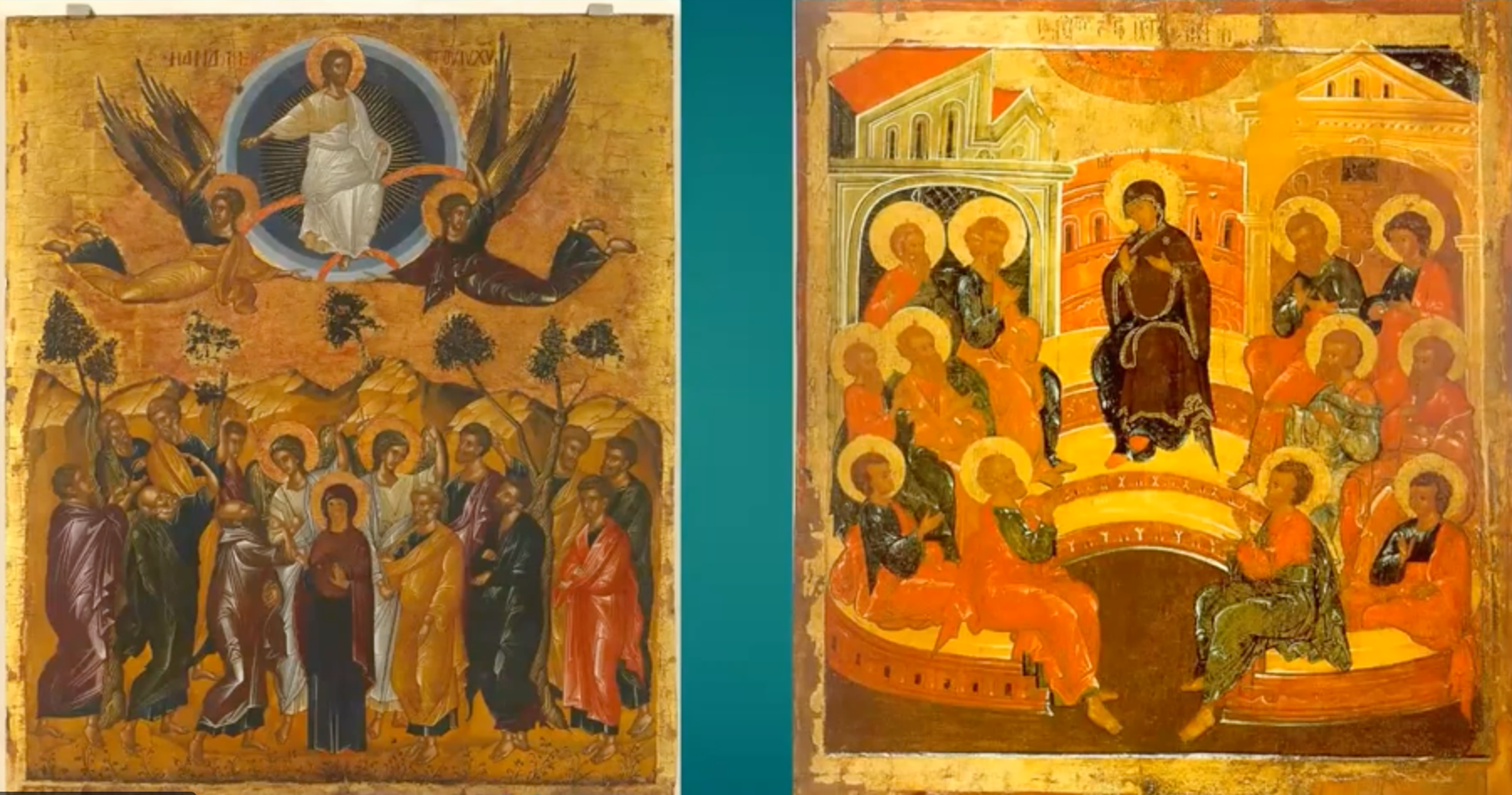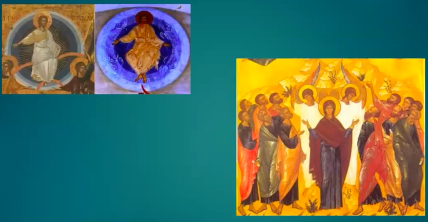 宗正教的圣像并非写实之作,它具有象征意义,象征着整个教会。其存在超越时空限制,存在于当下。我们可以看到两位天使身着白色长袍,向他们问道:你们为何仍感到惆怅呢?你们应当明白这个道理。耶稣基督是如何升天的?他有一天也会以同样的方式再次降临吗?我们看到十二使徒既兴奋又难过,他们真的感到非常激动,但同时又充满困惑。为什么我们会像被遗弃的孤儿一样?难道我们被遗弃了吗?但只有圣母马利亚被赋予了神圣光环。他是知道的,而且大家都能看到:除了圣母马利亚之外,其他人的头上还没有光环。只有圣母马利亚作为唯一被加冕的圣母,享有这神圣的光环,教会的象征。他因圣灵感召而受孕时,已领受圣灵,因此拥有光环。但其他使徒尚未获得这些恩赐。因为他们必须等到圣灵降临节才能获得圣灵的礼物。那么大家可以比较一下:在左边的图像中,最左侧的是描绘基督升天的圣像。