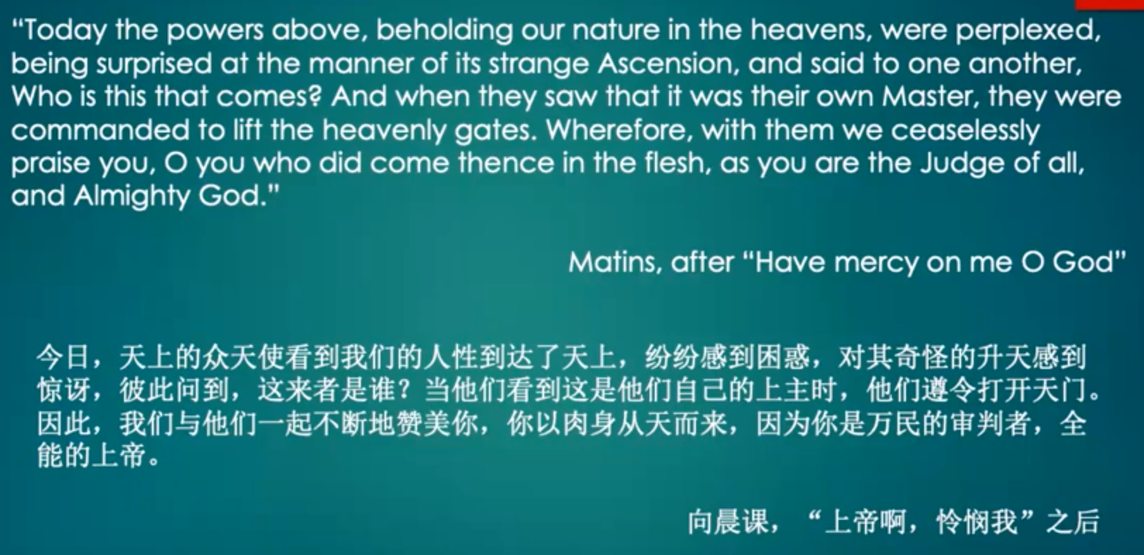 还有一个例子,大家可以看到,这个例子发生在升天节当天。晨祷课在升天节当天要唱的一首圣诗。他说:“基督啊,你确实从天而降,为世人带来救赎。作为上帝,你确实是亚当的后裔,他们都与你一同复活了。他们都先前被投入了地府的阴牢,你使人类随着你一同升入天国。“高举至与天父宝座同等的高度。因为你是仁慈且热爱人类的。这里有两个动作:一个是下降,一个是上升,基督的下降实际上包含两个层面的下降,即双重维度的降世过程。于是,他从天而降,为世人来到世上,这就是他的道成肉身。接着,他又降到了阴间,使亚当、夏娃以及所有人类都能与他一同复活。他的复活即是他的上升,但他的升天才是使他的上升得以完整。他的复活与他的上升,都不是为他自己,而是为了使人类能够随同他一起,从地府升到天上,他一直升至天国。因此,我们可以看到,他的升天实际上才是其对人类救恩的完成。那么在这些意义阐述完毕之后,我们也可以发现,圣诗不仅是对基督说话、对天主说话,而且对所有崇拜者来说话。那么对崇拜者所说的,那就是:「啊,是这样来表达的。他说:『所有的崇拜者,要把属世的事物留在地上,要把属于尘土的事物交于尘世。』