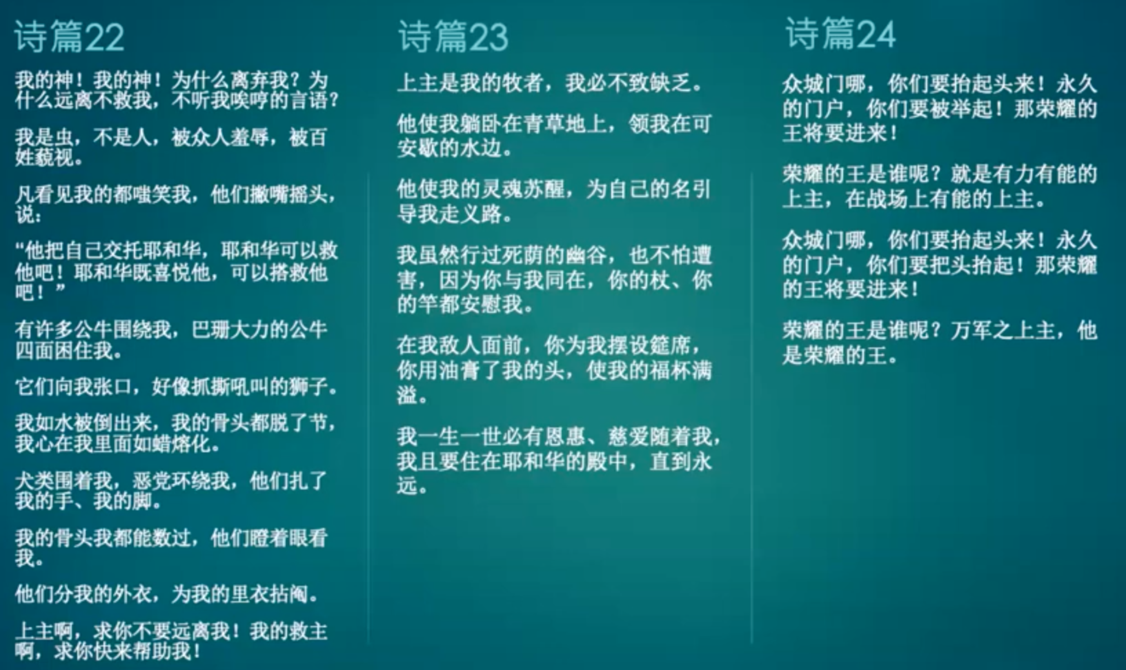 大家可以观察其礼仪规范:在升天节庆典中,这一场景被广泛使用。尤其在诗篇的吟诵中,这种神圣的升天意象得到了充分体现。诗篇第二十四篇不应单独阅读,而应结合其周边篇章(第二十二至二十四篇)共同研读。通过这种关联性阅读,我们可以观察到:这些篇章实际上共同讲述了基督的受难历程。他的复活与升天。虽然大家可能已理解,但建议参考我摘录的段落。诗篇第22篇讲述的是基督在十字架上的受难经历,具体描述了受难时的痛苦与救赎意义。对吧,他在十字架上要喊出来:“我的神,我的神,你为什么要离弃我?”然后,他还描述了他如何被仇敌包围。犬类环绕我,恶党包围我,他们扎了我的手和脚。我的骨头都能数得清。他们瞪着眼看我,他们分我的外衣,抢夺我的衣裳。诗篇22讲述的是基督在十字架上的受难。那么诗篇23呢?诗篇23内容很多,许多朋友可能都会背诵”上主是我的牧者,我必不缺乏”。它讲述的是什么呢?即使我行过死荫的幽谷,也不怕遭害。我无需惧怕伤害,因为有你与我同在。你的杖、你的竿都保护着我。在我敌人的面前,你为我预备了筵席。你又高举了我,这就是受高者吧?基督就是受高者的意思。这是我的悲,福与悲都已成就。一生一世都有恩惠,直到永远。实际上,他所讲述的就是基督的复活。诗篇第24篇延续了第23篇的内容,讲述的是他的升天。因此,大家可以清楚地看到这一点。