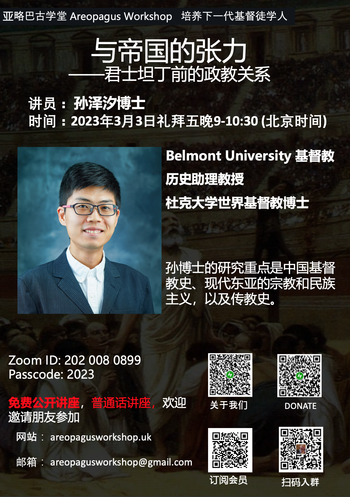 按:孙泽汐是Belmont University 基督教历史助理教授,杜克大学世界基督教博士。孙博士将在我们平台开一系列政教关系的讲座,此为第一场:与帝国的张力——君士坦丁前的政教关系。视频应讲员要求不予公开,但讲稿是公开的,并且与视频内容基本一致。此讲稿经Theodosius弟兄整理,泽汐博士修订而成。